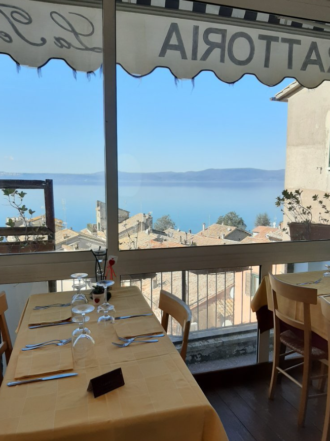 La terrazza sul lago deve il proprio nome allo splendido affaccio sul Lago di Bracciano. E' possibile infatti godere del meraviglioso panorama mentre si pranza o si cena, attraverso la piccola veranda. I posti sono pochi, per questo si suggerisce di riservare un tavolo specificando la preferenza per la terrazza. L'alternativa è la sala climatizzata, più spaziosa, o, durante la bella stagione, si può scegliere un tavolino sulla piazzetta caratteristica antistante il locale.